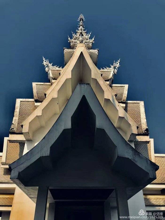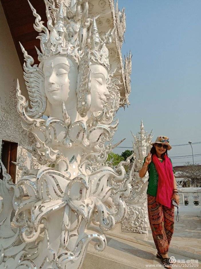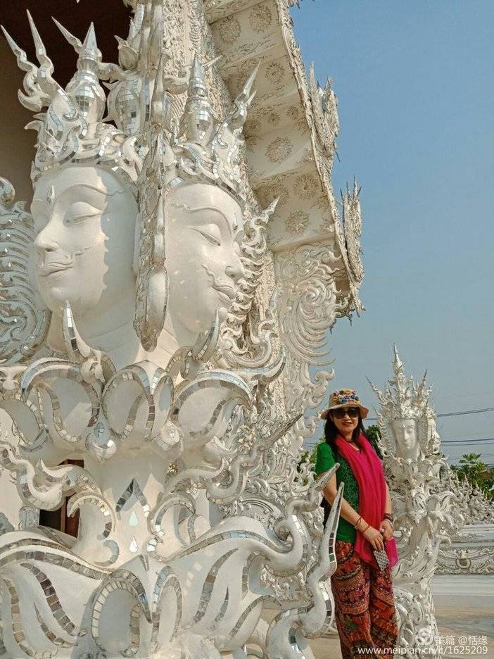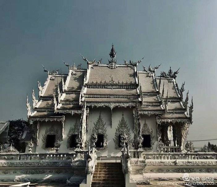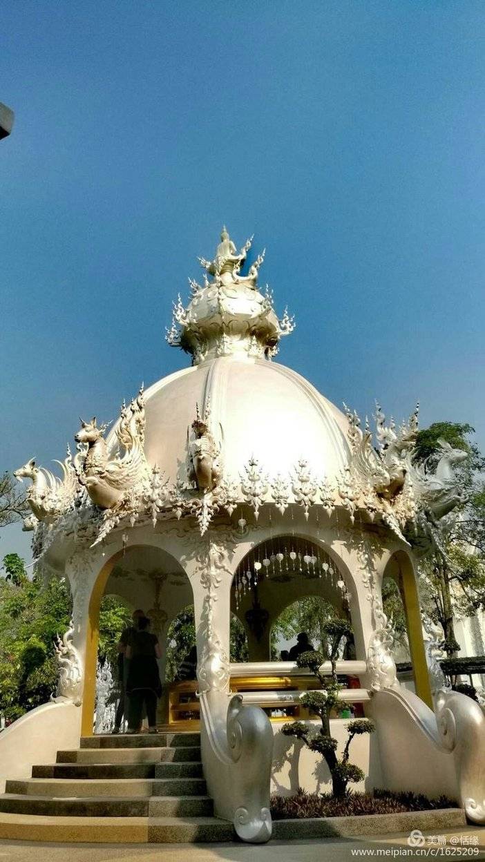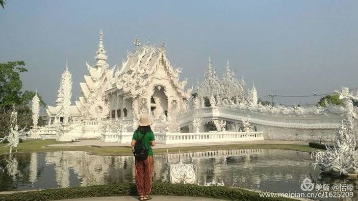 看惯了泰国金光闪闪的佛寺,这座洁白无瑕的庙宇,在蓝天下显得甚至不那么真实,纯白的屋顶,纯白的墙壁,纯白的基座,镶嵌在墙面的玻璃时不时反射出耀眼的银光,如同一座落入凡间的琼楼玉宇。