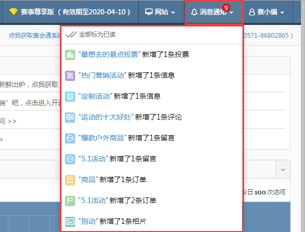 提醒范围:活动订单、商品订单、活动/商品留言、网站留言、文章/话题评论、新增话题、投票、表单、营销工具、相册